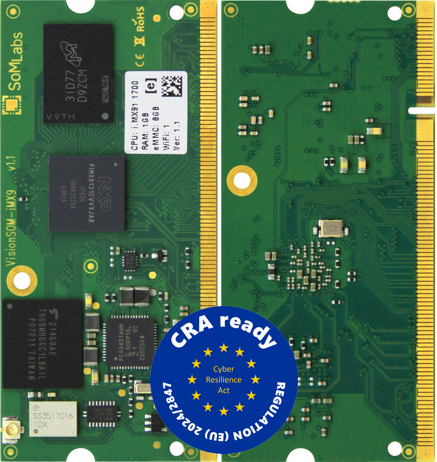 The VisionSOM-iMX91 (SLS17) family is a SODIMM-sized SoM based on the NXP iMX91 application processor which features ARM Cortex-A55 core, 16-bit LPDDR4 SDRAM interface, LCD parallel 24-bit display interface (maximum size 1366x768p60 or 1280x800p60), CCD camera interface, dual CAN-FD internal controllers, 1Gb/s Ethernet interfaces, security system,  and many others.